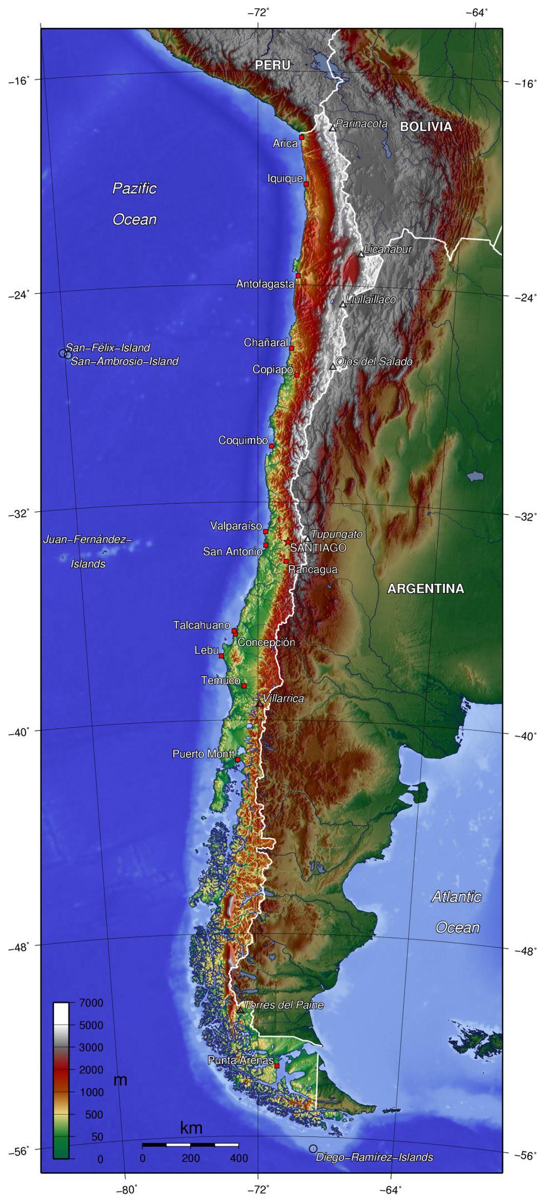 Kili gjeografi hartë. Fizike hartë të Kili (Amerika e Jugut - Amerikë) për të shkruar. Fizike hartë të Kili (Amerika e Jugut - Amerikë) për të shkarkuar.